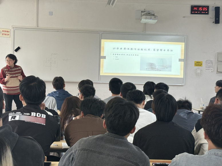 林青专家从事芯片的研发和应用工作20余年,凭借其丰富的行业经验和扎实的基础知识,在课堂上将功率器件芯片的有关理论知识和实际应用进行有机融合,向同学们展示了功率器件芯片的研究现状和应用环境,并详细介绍了芯片的质量标准和评价方案,强调了科学技术就是第一生产力的重要性。林青专家重点强调随着5G时代的到来和技术的进步,新型功率器件如碳化硅(SiC)和氮化镓(GaN)等材料制成的器件,因其优异的耐高压、耐高温、低损耗等性能,能够满足电力电子系统的高效率、小型化和轻量化要求,因此在新能源汽车、光伏发电、轨道交通、智能电网等领域具有明显优势。
