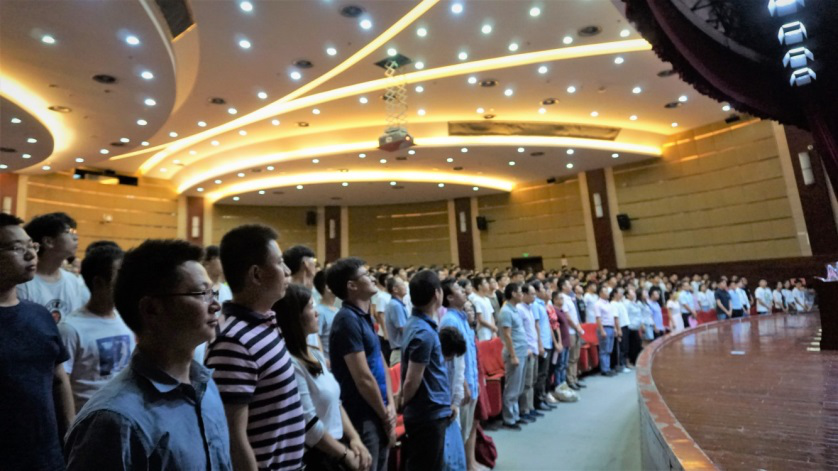 在庄严肃穆的会场,全体师生共唱国歌。
