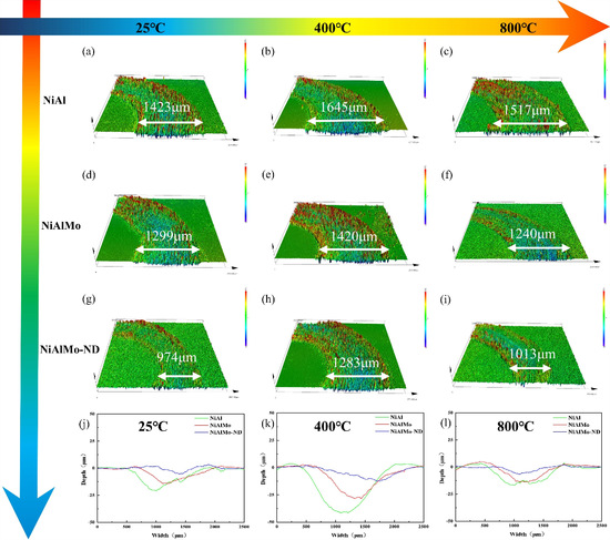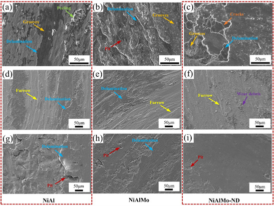 Fig. 2. Abrasion mark morphology of different coatings: (a)-(c)25℃, (d)-(f) 400℃,(g)-(i) 800℃.
