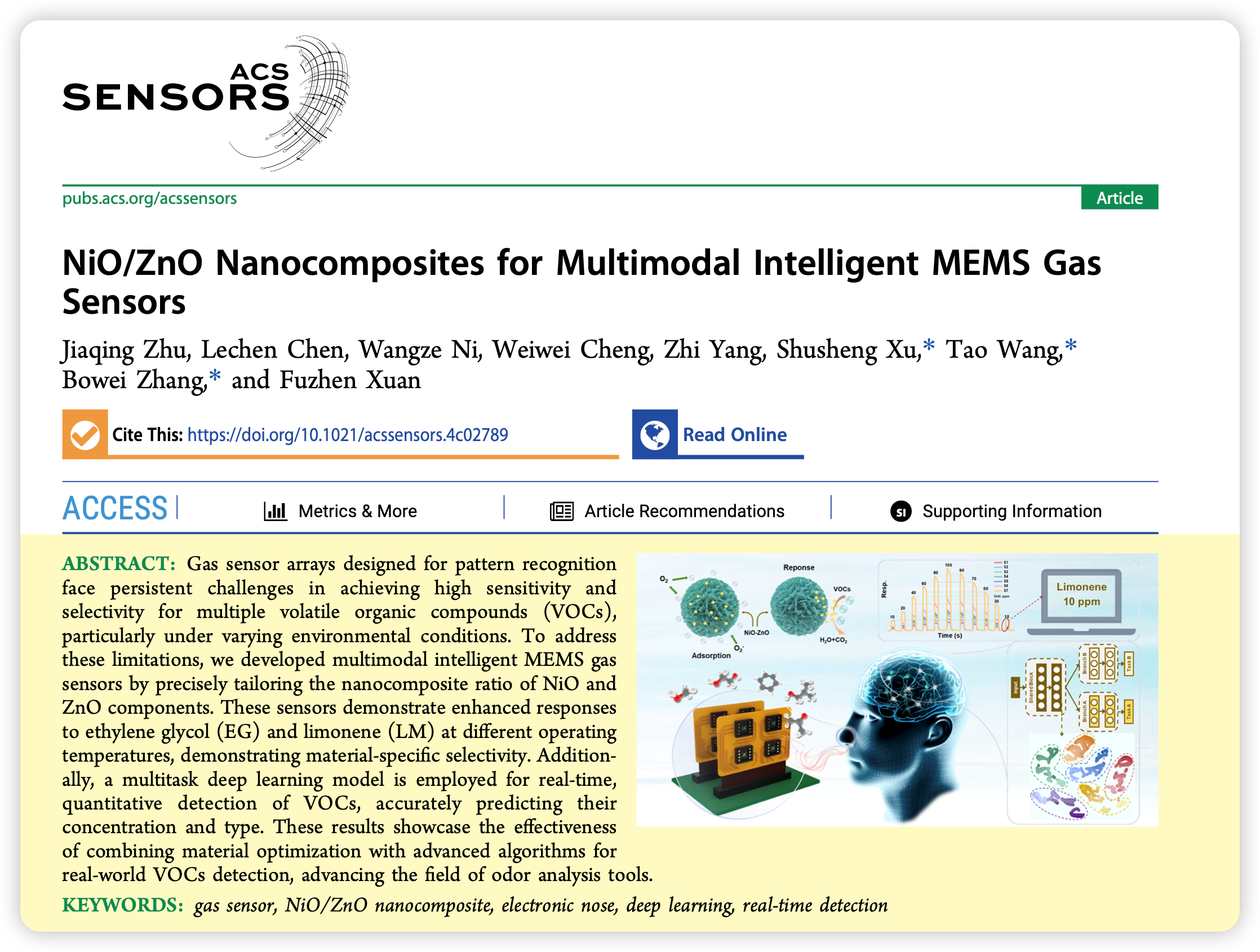 近日,威廉希尔足球官网徐书生博士指导硕士研究生朱佳清在传感器学科国际顶级学术期刊《ACS Sensors》(中科院一区Top,影响因子8.3)上发表了题为“NiO/ZnO Nanocomposites for Multimodal Intelligent MEMS Gas Sensors”的研究论文。徐书生为第一通讯作者,朱佳清为第一作者,华东理工大学的张博威教授和王涛副研究员为本论文的共同通讯作者。