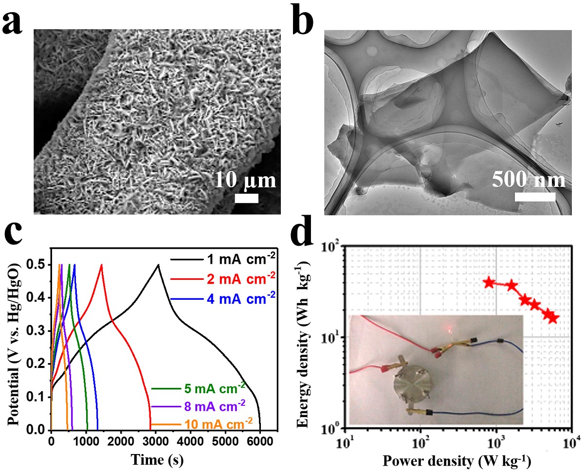 c、d:NiCo-(PTA)0.8(BTC)0.2的充放电性能及超级电容器性能