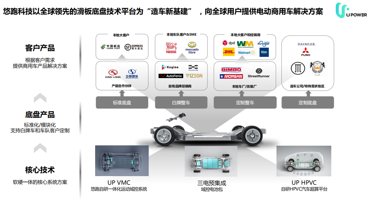 上海悠跑网络科技有限公司是新型智能电动汽车技术企业。该公司专注于滑板底盘技术的研发与商业化应用,通过UP超级底盘实现多车型兼容开发,可将整车研发周期缩短50%、成本降低70% 。企业服务对象涵盖车企、出行平台、生活服务平台及商业运营空间,已推出超级VAN等整车产品并获取大量国内外订单。