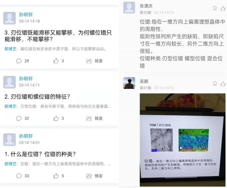 来看看精彩瞬间,孙明轩老师利用超星泛雅(学习通)平台,认真有序展开《材料化学导论》线上教学。课前精心准备,将课程简介、教学大纲、录制的教学视频、随堂测验及单元作业等上传到超星泛雅(学习通)在线教学平台上。课中全情投入,通过学习通群聊和QQ群引导员工签到、观看视频和问题讨论,与员工积极互动,保证在线教学质量。课后完成学习通上员工课后作业的批改及答疑解惑。