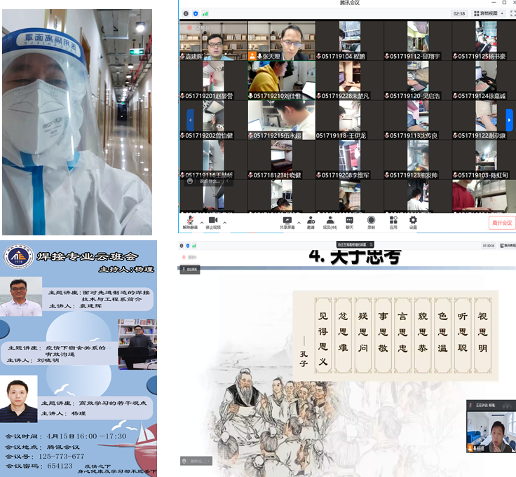 支部宣传委员杨瑾老师担任焊接系本科生的班主任,召开特殊时期的“云班会”。班会上,党员教师袁建辉同志为同学们作了“面向先进制造的焊接技术与工程系简介”的报告,刘晓明同志为同学们作了“疫情下宿舍关系的有效沟通”的报告,杨瑾同志为同学们作了“高效学习的若干观点”的报告。通过以上报告,帮助员工正确认识自己的专业,培养专业自豪感,同时从心理学的角度帮助同学们缓解疫情期间的心理压力,建立良好的室友关系,帮助同学们提高学习效率,培养了良好的学习习惯和思维模式。