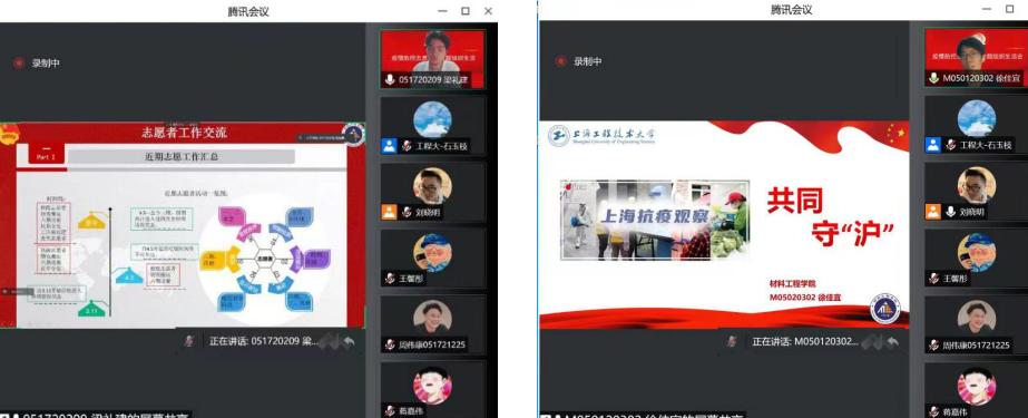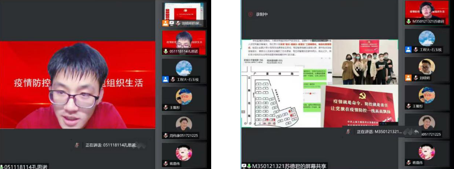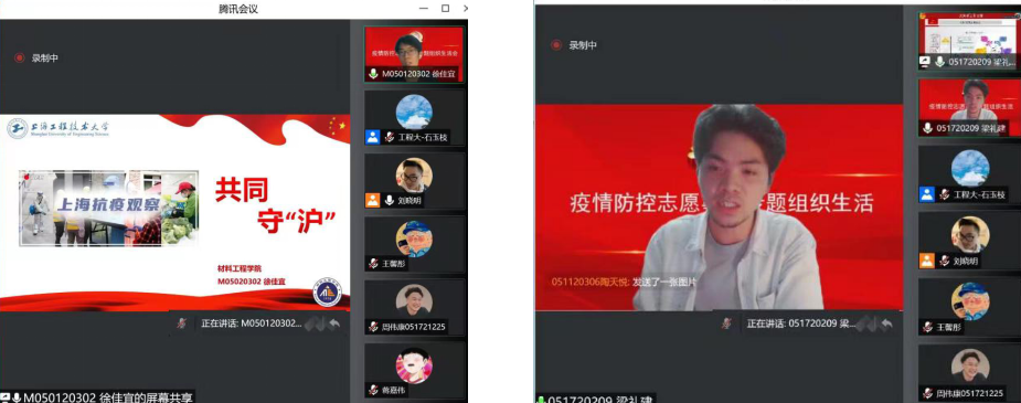 各党支部奋斗在一线的党员、入党积极分子志愿者代表分享了自己的抗疫志愿服务经历和感悟。本科生第一党支部党员苏德君与本科生第三党支部党员徐佳宜服务六期班车,保障“巴士走廊”畅通,帮助解决运送封控期间六期研究生同学的必备物资等,通过严格执行楼长、楼层长、寝室长三层网格化管理,六期的防疫工作达到了精准防控的目标。作为楼栋党小组组长的孔思诺同学,在关键时刻主动站出来解决问题,带领党小组内的全体成员积极响应号召,齐心协力制定相关解决办法,并及时与公司沟通,安抚同学们的情绪。本科生第二党支部党员杨石鑫、姚睿洁以及本科生第三党支部发展对象梁礼建同学积极加入公司组织的校园志愿服务队,当好“校园巡逻队队长”,在校园内自早7点至晚22点,全时段开展巡逻、安全宣传等工作,同时为同学们发放抗原、运送餐食,组织在校生全员核酸,维持核酸采样秩序。
